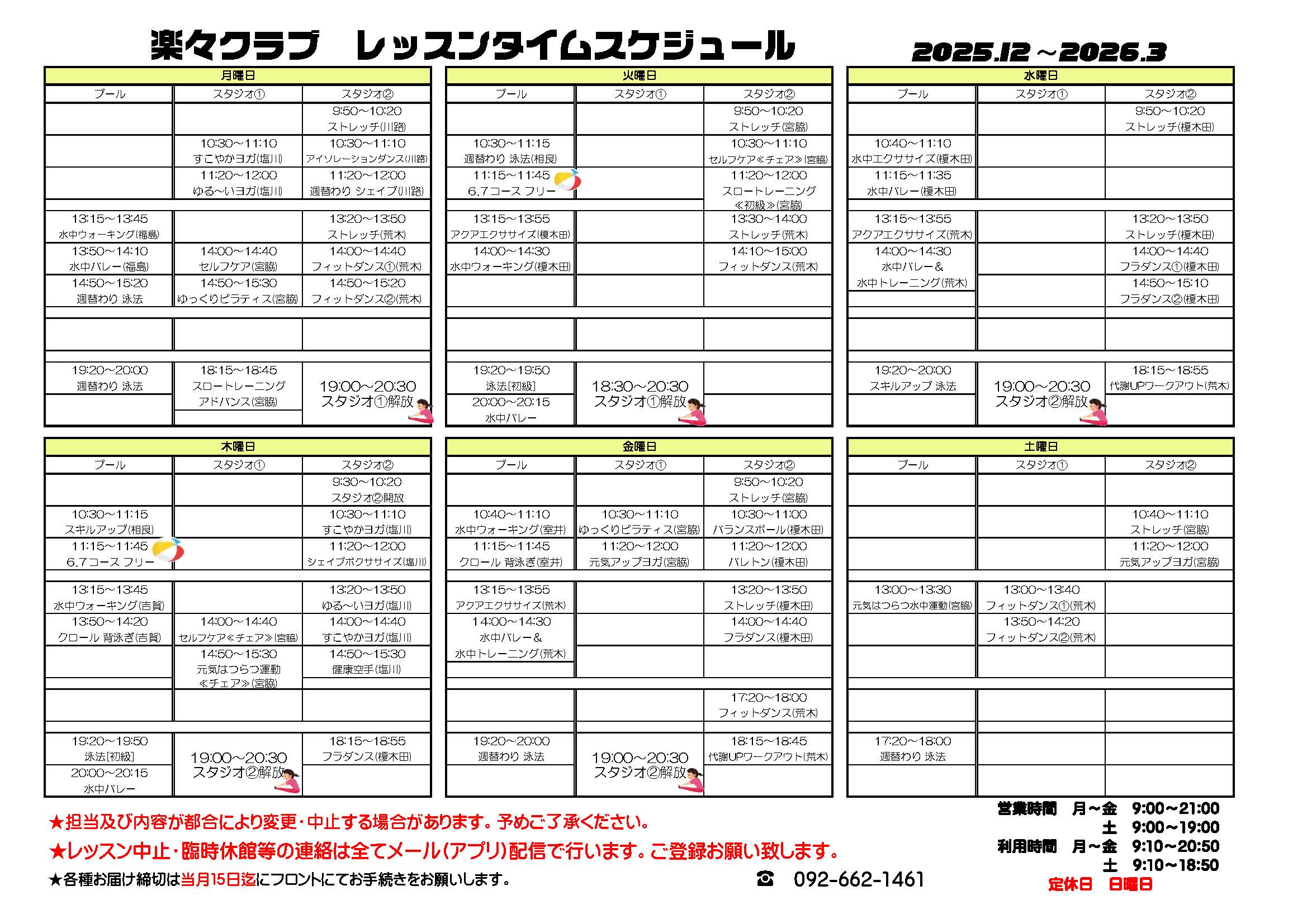 お知らせ:成人タイムスケジュール 2025年12月~2026年3月