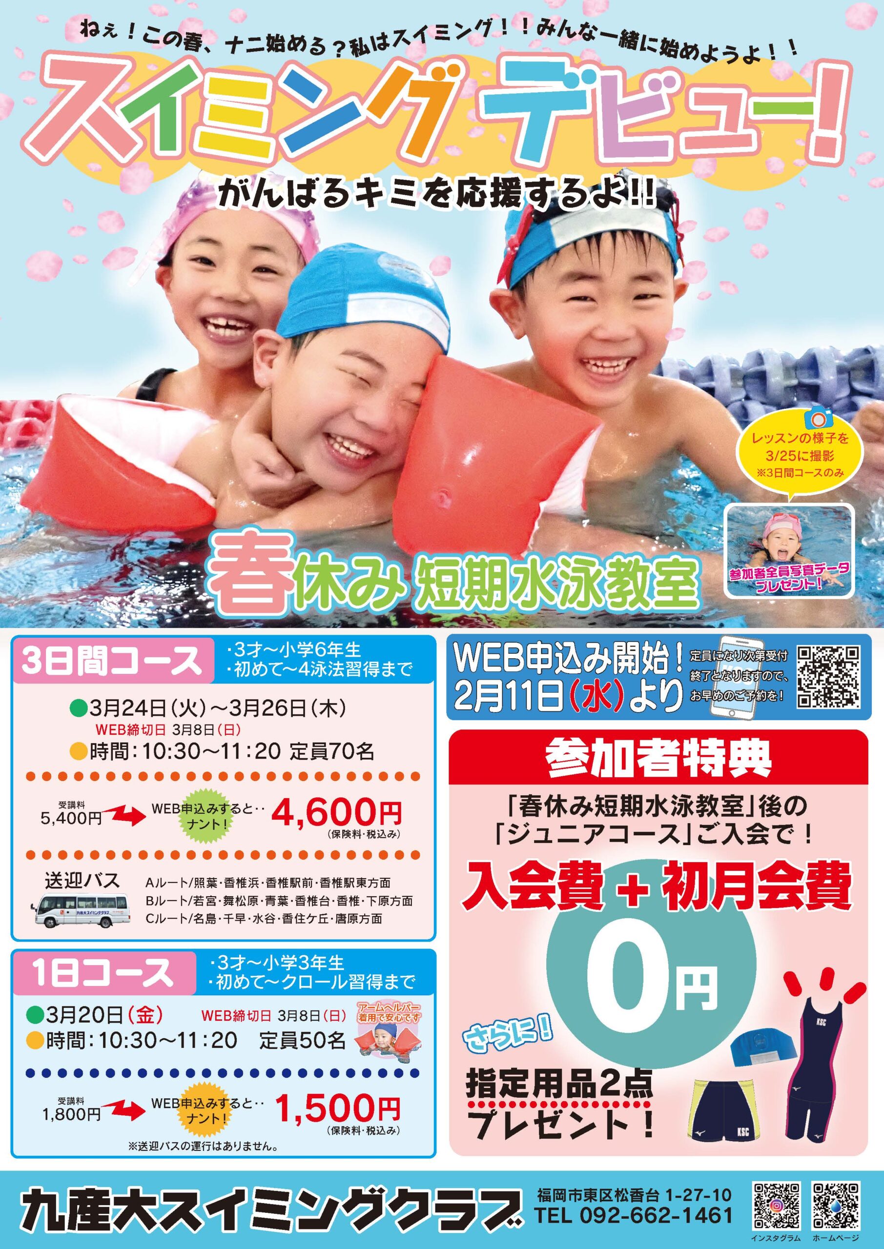 春休みの短期水泳教室を開催いたします。今回は、[1日コース] [3日間コース]がございます。 参加対象は、3歳から小学生までのお子様です。